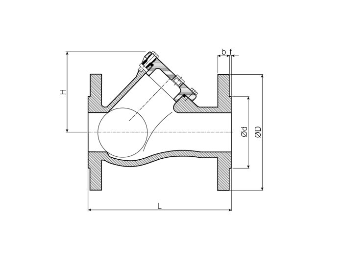 In-line ball check or non-return valve, made of ductile iron GJS-400-15. Closing ball in resin with NBR coating. NBR sealing gasket. Flanged connections according to UNI EN 1092-1 PN16. Surface treatment: epoxy painting. The N6VRFL-F check valve is generally used in drainage systems for sewage or liquids with suspended solids in civil and industrial installations where it is necessary to prevent the return of the fluid and operates at a nominal working pressure (PN) of 10 bar.